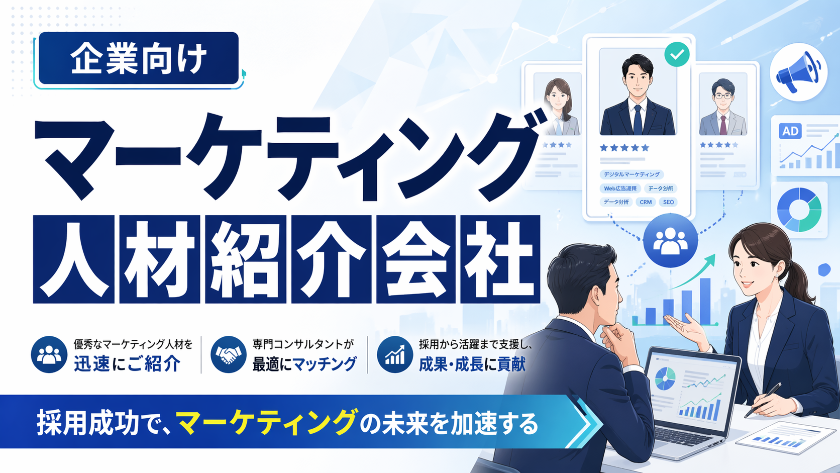 マーケティング人材の採用は、専門性や市場の変化が激しいだけに、実績と知見のある人材紹介会社を活用することが成功の近道です。